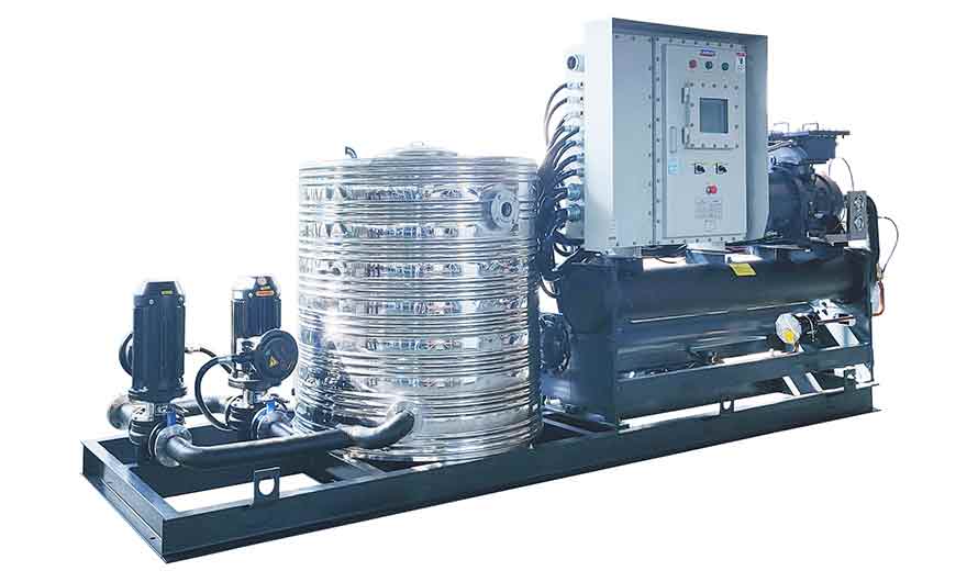 2、以鹽水為載冷劑的撬裝式螺桿冷水機(jī),蒸發(fā)器需防腐設(shè)置,控溫范圍在-5度至-40度;